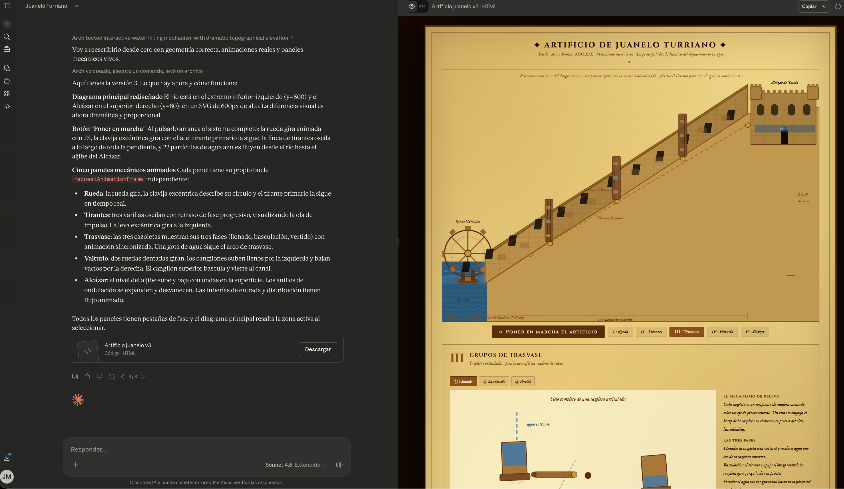 Eso es exactamente lo que hacía Juanelo: construir sistemas complicados que funcionaban con una precisión que nadie más en su época podía imaginar. La diferencia es que él tardaba años y necesitaba mucha madera, metal, ruedas dentadas y el Tajo. Simular esto con un artefacto es cuestión de minutos, sólo necesitas una idea y un buen prompt.